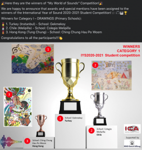 Uluslararası Ses Yılı 2020-2021 kapsamında dünyanın her yerinden ilkokul, ortaokul ve lise öğrencileri için Uluslararası Yarışma düzenlenmektedir. Öğrencilerden, IYS2020’nin “Toplum ve Dünya için Sesin Önemi” sloganından ve “Dünyanın Sesi” şarkısının melodisi ve sözlerinden esinlenerek, “Benim Dünyamda Sesler” teması ile ilkokul + ortaokul öğrencileri ve lise öğrencilerine yönelik olmak üzere iki ayrı kategoriye göre belirlenmiş çalışmalar istenmektedir. Kategorilerine göre detaylı bilgiler aşağıda verilmiştir. Yarışma posteri için tıklayınız.